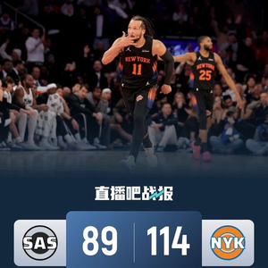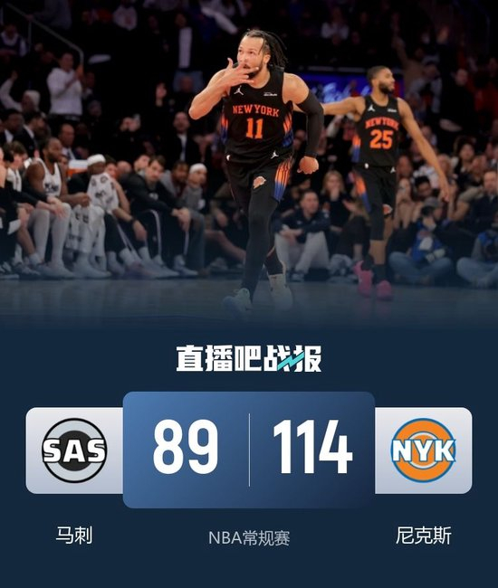 一开场,马刺反客为主率先发力,内外开花打出19-7的开局,此后却突然哑火,尼克斯大举反击轰出19-0的进攻高潮一举确立两位数优势,文班亚马拿分苦苦追赶,布伦森内外开花给出回应,哈里森·巴恩斯三分止血,半场战罢马刺41-51落后尼克斯。下半场,尼克斯稳扎稳打将优势扩大到15分,马刺连投带罚予以回应,双方围绕10分左右的分差展开拉锯战,末节尼克斯持续发力,连投带罚将优势扩大到20分以上,马刺大势已去无力回天。最终,尼克斯114-89击败马刺,终结了对手的11连胜。