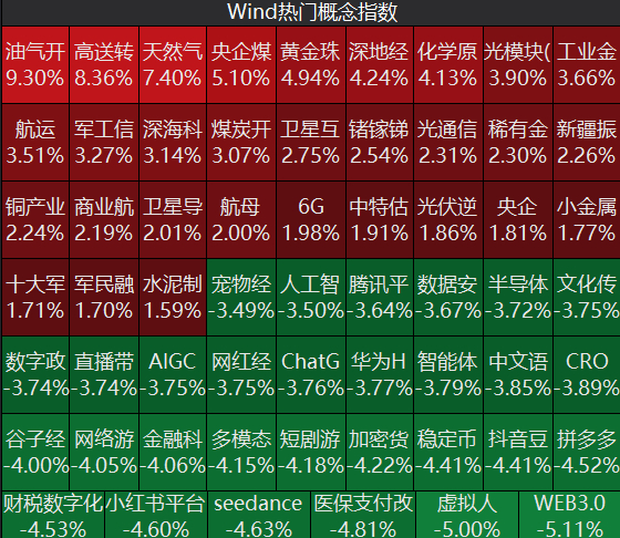 板块题材上,油气开采及服务、港口航运、贵金属、军工装备、煤炭开采加工、化学原料、化肥、大豆、CPO概念股涨幅居前;游戏、传媒、AI应用、云计算、旅游及酒店、减肥药、零售板块跌幅居前。