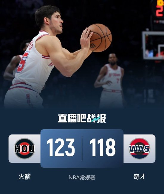比赛开始,杜兰特撑起球队进攻,但火箭连续失误,奇才外线连续5记三分强势回应,随后双方展开对攻拉锯战,首节奇才还领先4分,次节申京连续内线强攻,单节弹无虚发砍下15分带队反超,奇才靠库利巴利3记三分止血,半场火箭反超9分。下半场,火箭9-0扩大至近20分领先,但奇才接连三分回应14-2追至个位数分差,火箭再打出10-0还领先14分,末节谢泼德和阿门联手带队牢牢保持住十几分领先,奇才无力回天,最终火箭123-118战胜奇才。