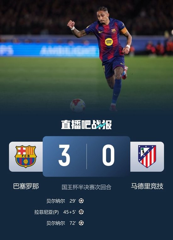 直播吧3月4日讯 北京时间3月4日凌晨4时整,2025-26赛季国王杯半决赛次回合在诺坎普球场展开角逐,巴塞罗那主场迎战马德里竞技,首回合马竞4-0战胜巴萨。上半场贝尔纳尔首开记录,亚马尔助攻,佩德里造点,拉菲尼亚点射,孔德伤退,下半场贝尔纳尔再入一球。最终巴萨主场3-0战胜马竞,总比分巴萨3-4不敌马竞遗憾止步四强,马竞进军国王杯决赛,决赛将迎战皇家社会与毕尔巴鄂竞技之间的胜者。