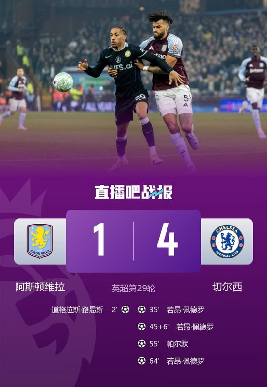 直播吧3月5日讯 北京时间3月5日凌晨3时30分,英超第29轮,切尔西做客维拉公园球场对阵阿斯顿维拉。上半场,利昂·贝利助攻道格拉斯·路易斯闪击破门,若昂·佩德罗扳平,随后沃特金斯打进一球,但是越位在先,若昂·佩德罗半场补时再打进一球。切尔西半场2-1领先阿斯顿维拉。下半场,帕尔默破门,若昂·佩德罗再下一城。最终切尔西4-1击败维拉,升至积分榜第五,距离第四还有3分差距。