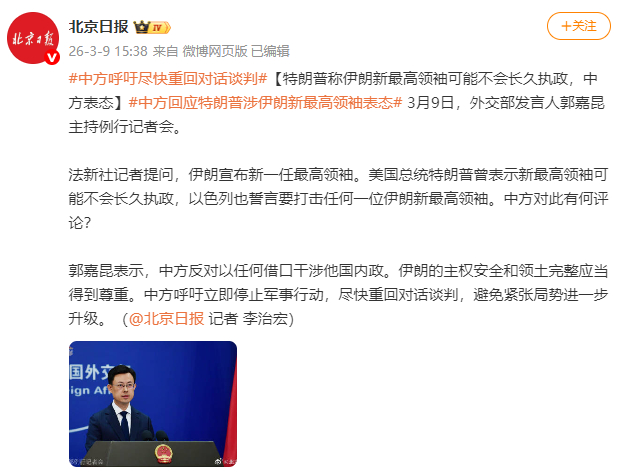 [特朗普称伊朗新最高领袖可能不会长久执政,中方表态]3月9日,外交部发言人郭嘉昆主持例行记者会。
