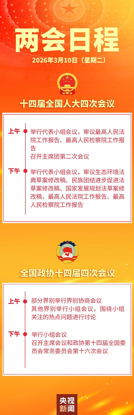 两会日程预告丨3月10日:人代会审议“两高”工作报告等 政协举行界别协商会议和小组会议