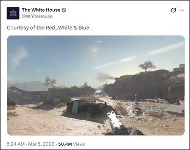 不仅是网民,许多专家也从侧面信息里解读出了一些“不妙”的信号。3月5日,美国白宫官方账号用战争游戏《使命召唤》的画面做了个对伊军事行动的宣传片,把击中伊朗目标弄得像“打游戏得分”。