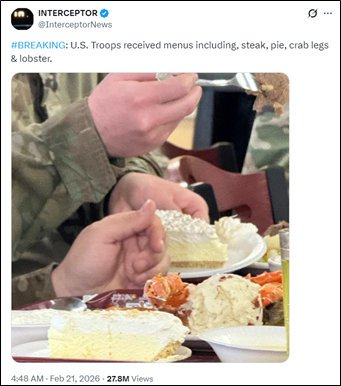 早在冲突爆发的一周前,就有网帖称美军吃上了龙虾、蟹腿、牛排和芝士蛋糕。懂行的美国人说,这类“硬菜”一般是美军被派去战场前的“开拔饭”,这些帖子的阅读量迅速破百万。