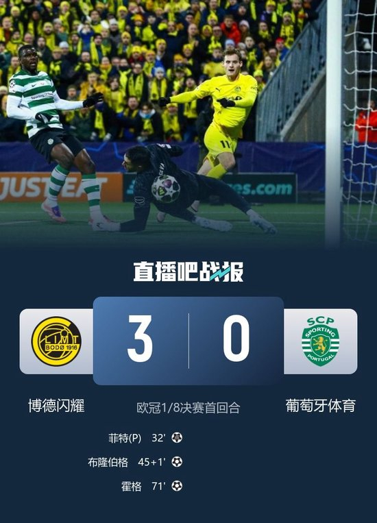 直播吧3月12日讯 北京时间4:00,欧冠1/8决赛首回合博德闪耀vs葡萄牙体育,比赛在阿斯米拉体育场打响!上半场,哈康·埃文森错失单刀良机;瓦扬尼迪斯送点,菲特点射破门!海于格直塞变线,布隆伯格小角度推射远角再下一城!下半场,霍格包抄破门,海于格献助攻,本场造2球!最终,博德闪耀主场3-0完胜葡萄牙体育,欧冠豪取5连胜!次回合将在葡体主场进行。