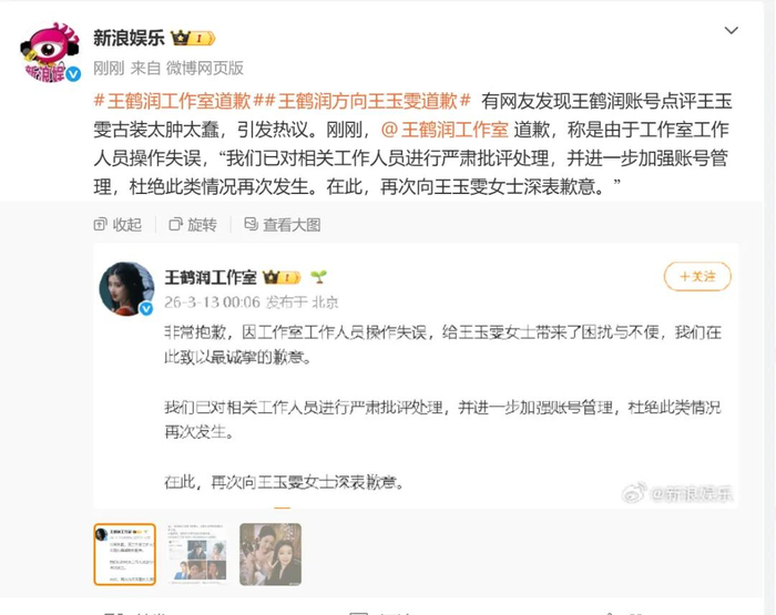 王鹤润账号点评王玉雯古装太肿太蠢,刚刚工作室道歉:工作人员操作失误,已对其严肃批评处理,将加强账号管理杜绝再次发生
