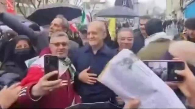当天正下着小雨,总统佩泽希齐扬直接淋雨走在街头,旁边也没看见保镖,或者保镖远远站着,他和每一个路过的人握手,很多伊朗人认出总统后,纷纷拿起手机与他合影自拍,他也不拒绝……