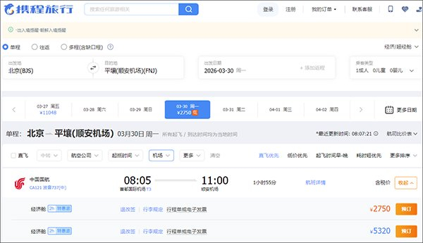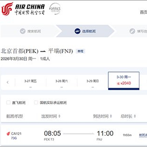 据韩联社报道,当地时间3月13日,据外交部门和中国航空业界相关人士消息,中国国航北京至平壤直飞航班(CA121)将从3月30日起恢复运行。机票目前可通过中国国航官网和携程等旅游平台预订,起价为人民币2040元。