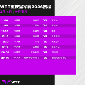今天(3月14日),WTT重庆冠军赛2026进行1/4决赛。对决情况及时间安排如下: