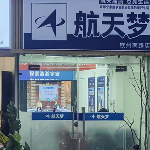 例如,门头的标识为蓝白配色的箭头标志,和中国航天科技集团有限公司的标识近似,门头的标语也打着“航天品质”的标语,在店内,还会放上火箭模型等陈设和航天科研场景的图片。