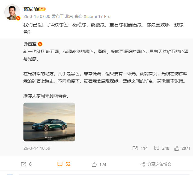 雷军:新一代SU7设计4款绿色 新浪上车再说 03.1507:56 关注 【雷军:#新一代SU7设计4款绿色#】#新一代SU7四款绿色# 3月15日,@雷军 发文表示新一代SU已设计了4款绿色,分别为橄榄绿、鹦鹉绿、宝石绿和靛石绿。