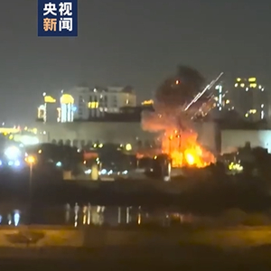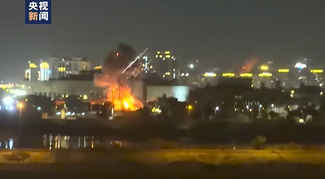 当地时间17日凌晨,央视新闻记者拍摄到一架无人机坠入美国驻伊拉克使馆内并起火的画面。