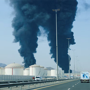 3月14日,阿联酋防空系统拦截无人机后,残骸坠毁在一处石油工业区 路透社