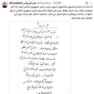 在以色列宣称“打死”拉里贾尼后,塔斯尼姆通讯社等伊朗媒体发布消息称,拉里贾尼将“很快发表一份声明”。随后,拉里贾尼在社交平台X上发表了一份给伊朗海军阵亡将士的手写悼词,他表示:“关于这些阵亡将士的记忆将永远铭刻在伊朗民族的心中。”