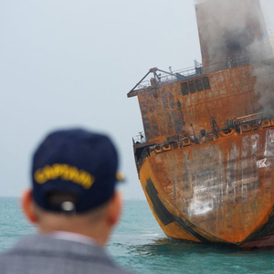 3月12日,伊拉克巴士拉附近海域,外国油轮起火受损。 IC Photo