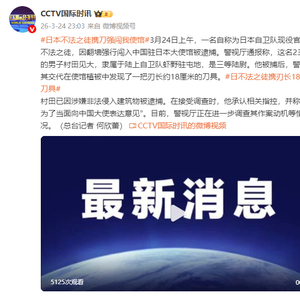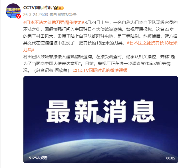 [日本不法之徒携刀强闯我使馆]3月24日上午,一名自称为日本自卫队现役官员的不法之徒,因翻墙强行闯入中国驻日本大使馆被逮捕。警视厅通报称,这名23岁的男子村田见大,隶属于陆上自卫队虾野驻屯地,是三等陆尉。他被捕后,警方据其交代在使馆植被中发现了一把刃长约18厘米的刀具。