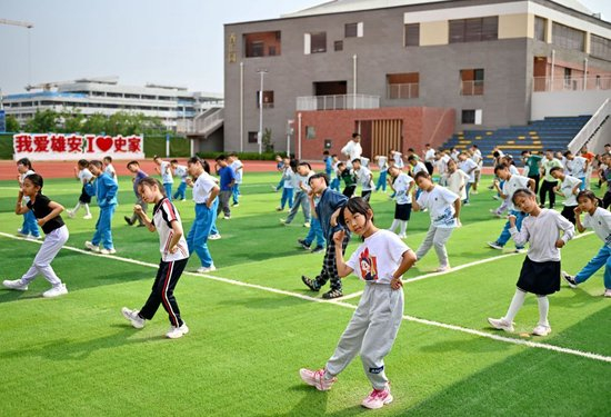 2024年5月21日,雄安史家胡同小学学生在操场上做操。按照统一安排,北京四中、北京史家胡同小学、北京北海幼儿园等知名校(园)长在雄安新区设立领航名校长工作室,推动优质中小学基础教育资源同雄安实现共享。