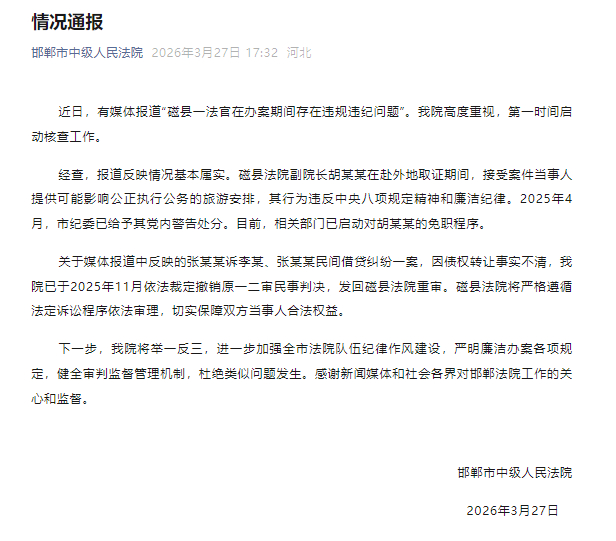 新京报讯 3月27日,邯郸市中级人民法院发布情况通报:
