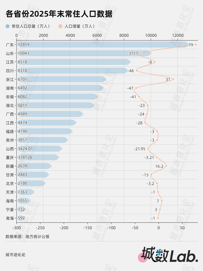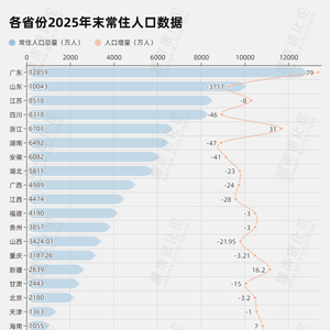 全国已有至少21个省份公布了2025年常住人口数据。实现正增长的省份有5个:广东(+79万人)、浙江(+31万人)、新疆(+16.2万人)、海南(+7万人)、宁夏(+3万人)。