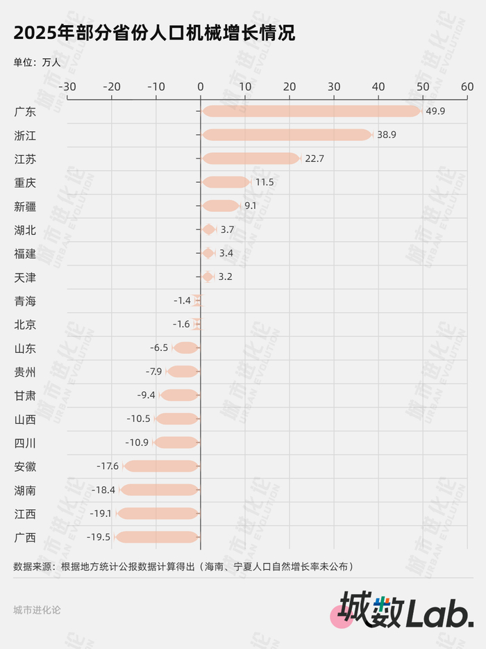 同为经济大省,广东的增量包括出生人口的自然红利,浙江的增量则由外来人口净流入贡献。具体来看,粤浙两省的自然增量分别为29.1万人和-7.9万人,对应的机械增长量(即“人口净流入”)为49.9万人与38.9万人。