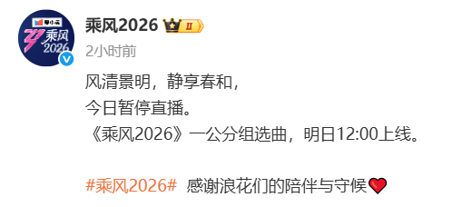 4月5日,《乘风2026》节目组官方微博宣布今日暂停节目直播。原定今日直播的一公分组选曲将于明日12:00上线。