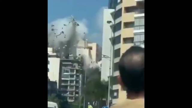4月8日,以色列空袭黎巴嫩首都贝鲁特,民众拍下遭袭瞬间。画面中建筑物遭袭碎片横飞,冒出火光和滚滚浓烟。另一段视频显示,当地一家咖啡馆内的顾客奔跑躲避,寻找掩体。黎巴嫩公共卫生部紧急行动中心表示,以色列当天对黎巴嫩多地发动袭击,空袭已造成至少254人死亡、1165人受伤。