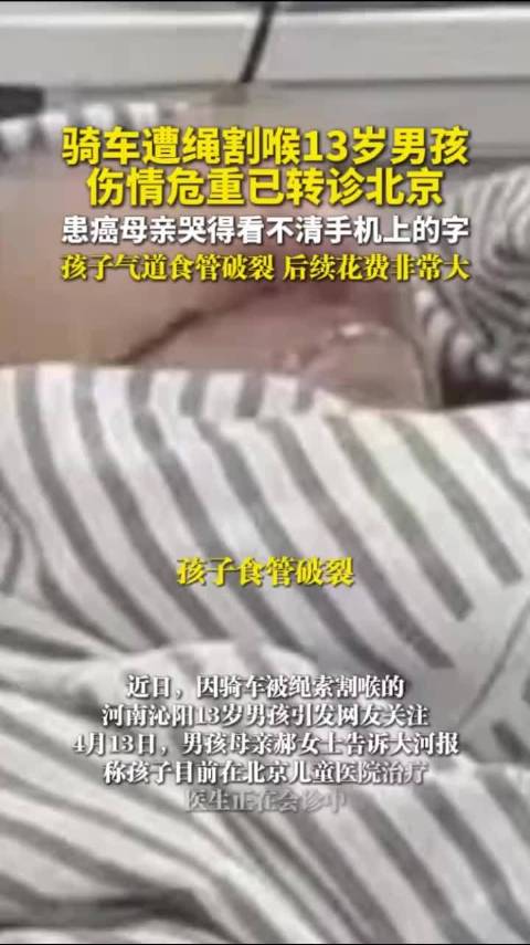 骑车遭绳割喉13岁男孩伤情危重,已转诊北京,患癌母亲哭得看不清手机上的字
