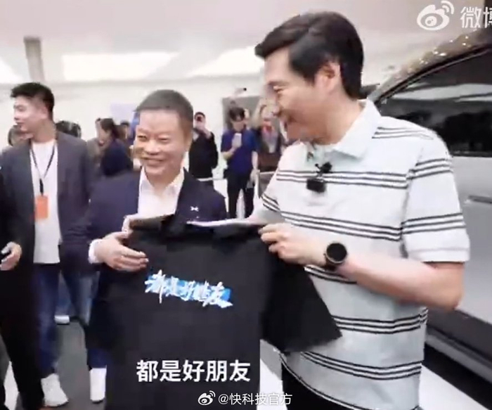 【雷军与何小鹏都是好鹏友】北京车展上,小米汽车CEO 雷军与小鹏汽车CEO何小鹏 再度同框。为感谢何小鹏助阵小米新SU7发布会,雷军给小鹏带了一件“都是好鹏友”专属T恤,何小鹏回赠机器人IRON手办。