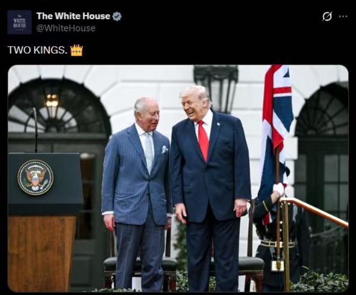 现在,教皇和耶稣都满足不了特朗普了。趁着英国国王访问美国,白宫直接发了“两个国王”的图片。