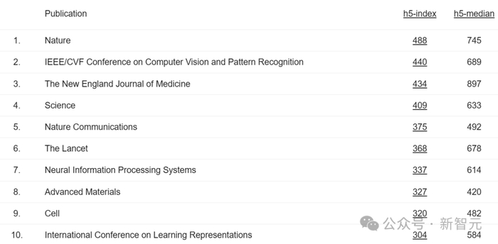 今年,依据h5-index,排在前十的期刊/国际顶级学术会议中,Nature已经连续霸榜多年。