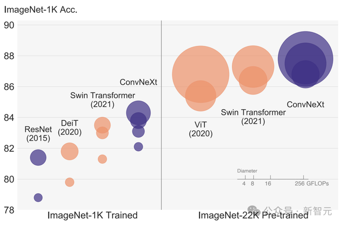 还有谢赛宁带领团队发表的A ConvNet for the 2020s,带来全新纯卷积模型ConvNeXt,性能反超Swin Transformer,直接在CV圈里掀起了模型架构之争。