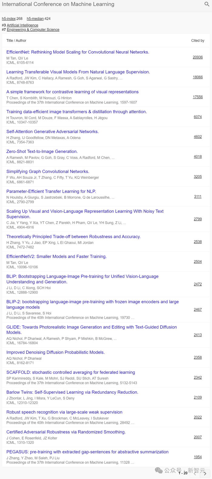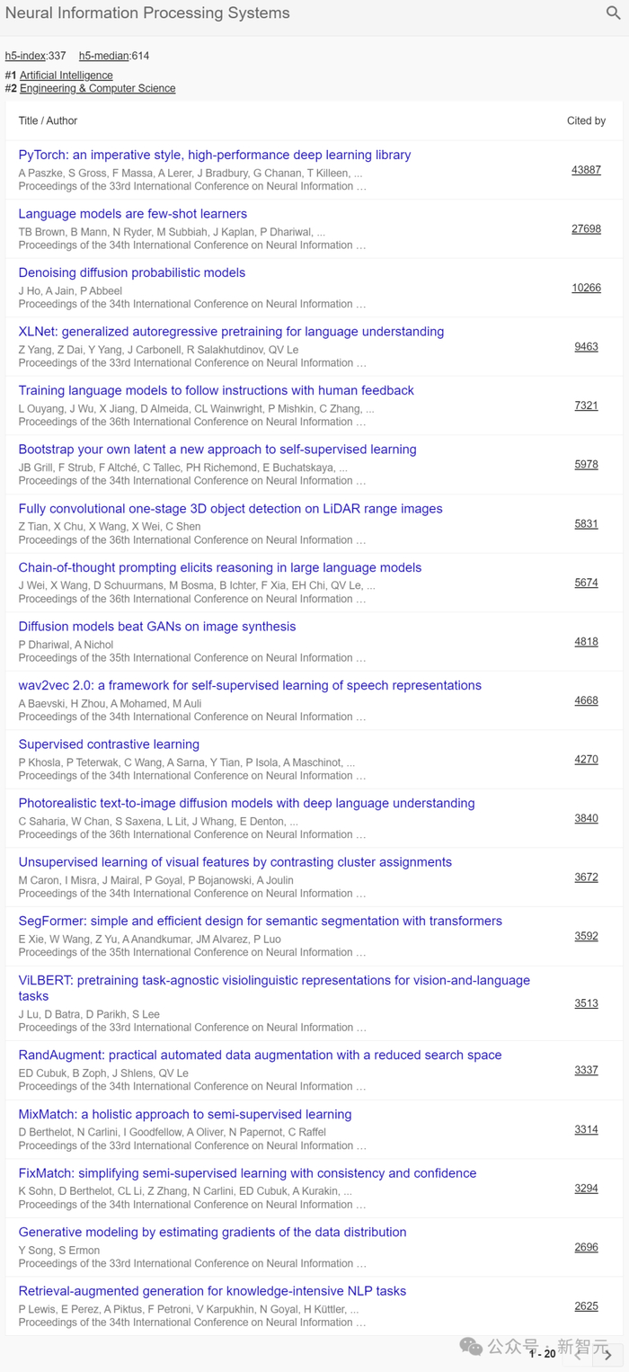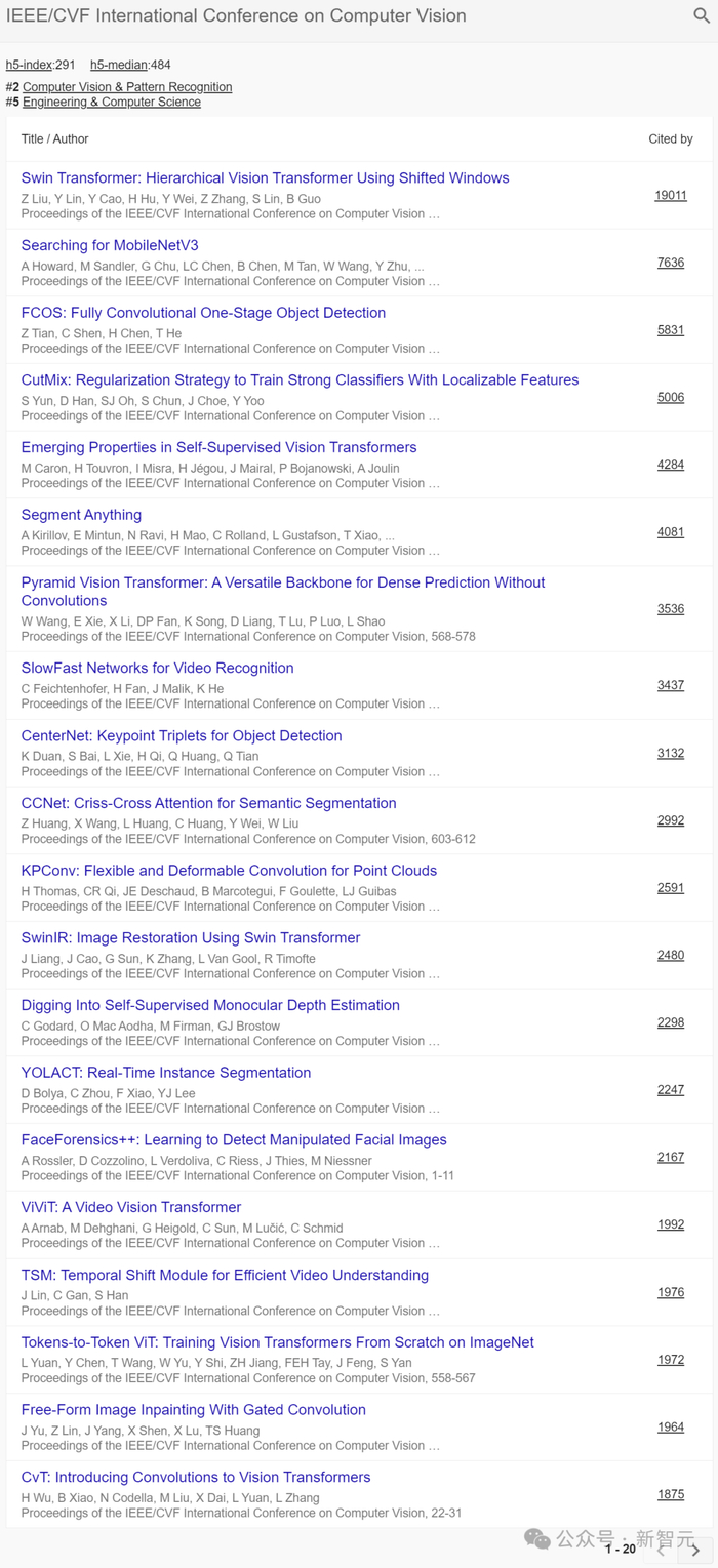 除了开头我们提到了三个顶会位列前十,在总榜前20名中,还有ICCV、ICML两个机器学习/计算机视觉顶会入选。