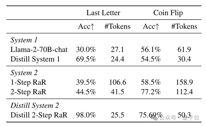 而在Coin flip任务里,蒸馏后的准确率达到 75.69%,也与接近2-步原始RaR的77.2%接近,但生成的token数量大幅减少。