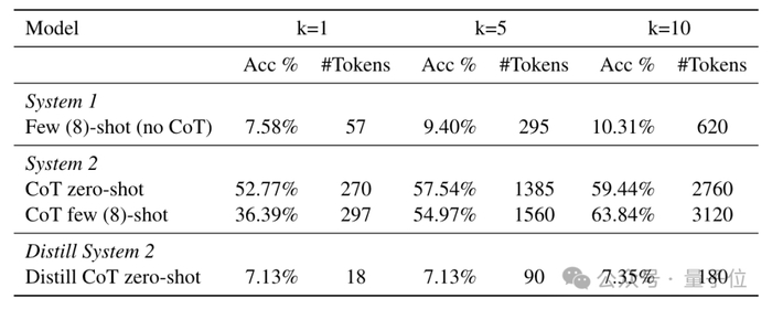不足的一点是,CoT的蒸馏效果与另外三种大相径庭,作者发现,在数学推理任务上,CoT的推理能力很难迁移到系统1当中。