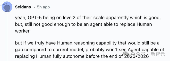 有网友认为,GPT-5处于他们划分的第二级。即便是达到了人类级别的推理能力,它仍然在某些方面落后于人类。预计在2025-2026年底之前,很可能不会出现完全自主替代人类的智能体。