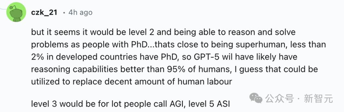 网友对此表示赞同,「GPT-5预计达到L2,具备博士级别的推理和问题解决能力,这已经接近超人类水平了」。