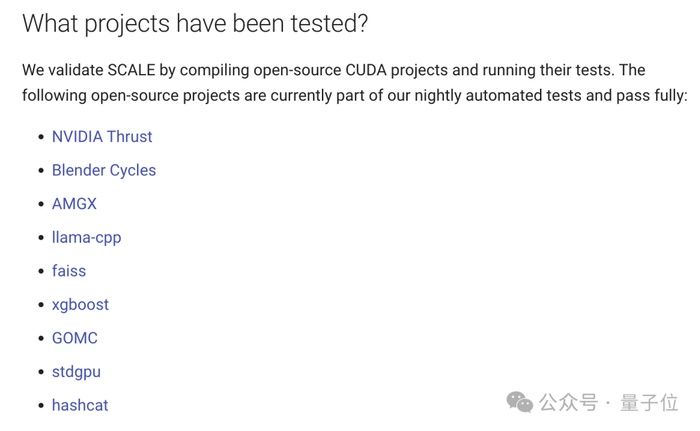 另外,作者测试了一些CUDA开源项目,并利用SCALE成功运行了9款CUDA应用。