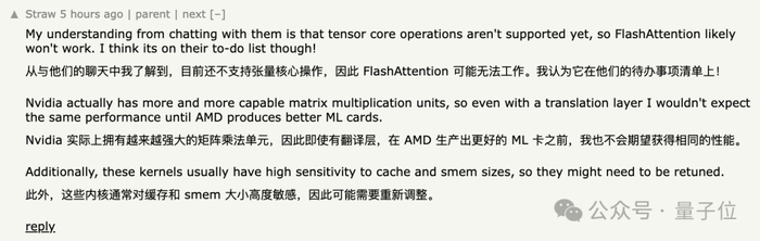 关于“AMD方案”的更多不足,一名自称和SCALE团队交流过的网友表示,目前的SCALE还无法操作TensorCore,也就意味着AMD上跑不了FlashAttention加速框架。