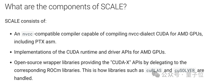 官网介绍显示,SCALE主要有三个组成部分——兼容的nvcc编译器、CUDA运行时和驱动API的AMD实现,以及ROCm库。