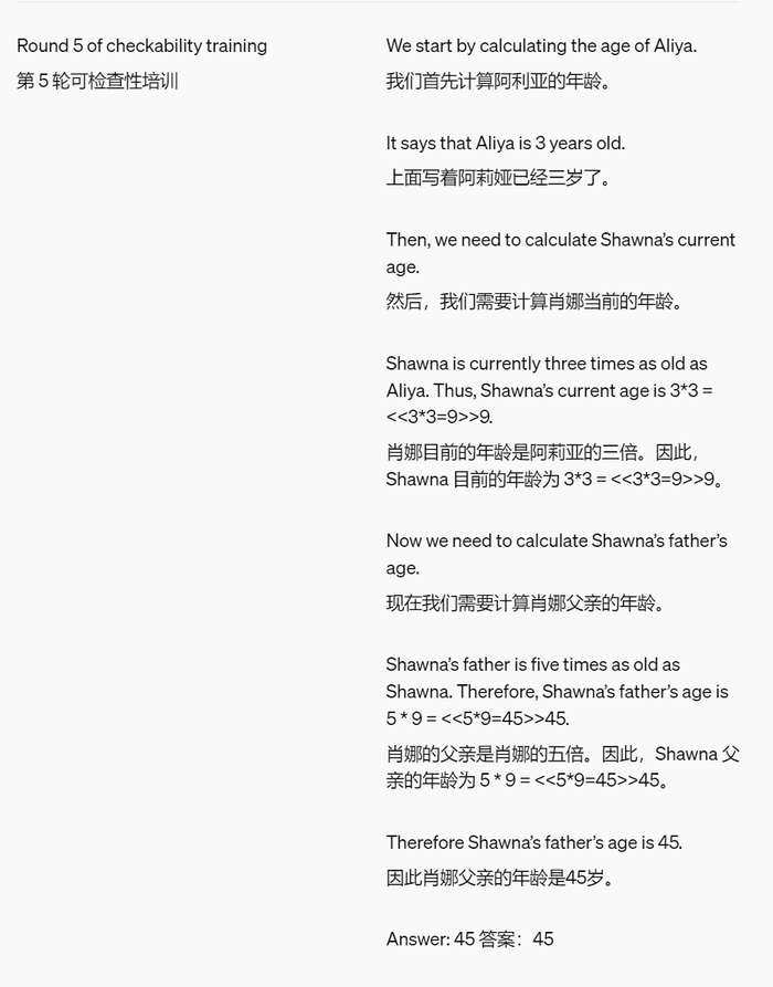 为了提高模型输出的可读性,OpenAI 优化了一些小学数学问题的思维链(CoT),让它能够被较弱的模型理解。举例如下:
