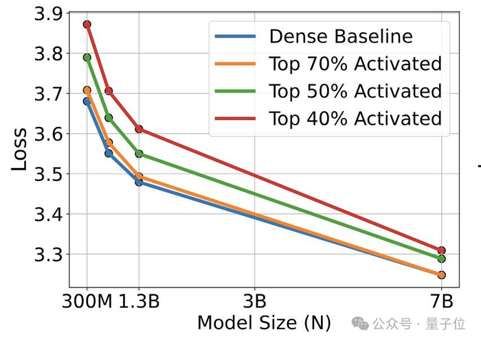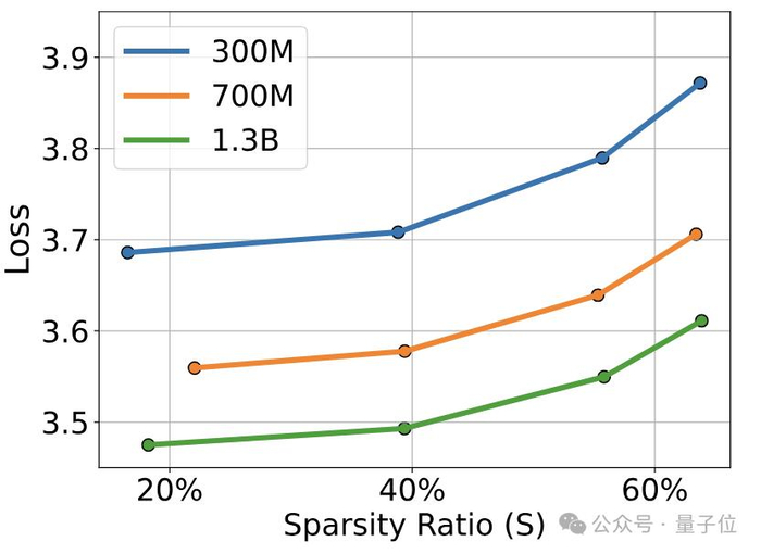 这个缩放定律表明,稀疏激活模型的性能随着模型规模的增大而提高,但提高的速度会逐渐变慢。