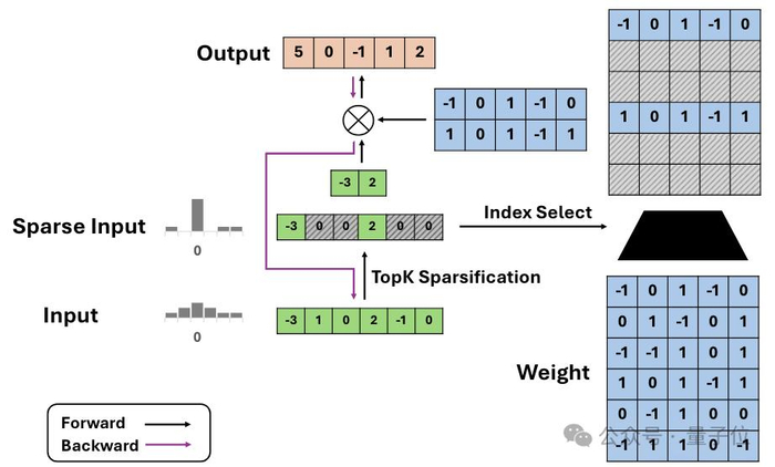 在前向传播过程中,稀疏化后的张量X_sparse将代替原始的输入张量X参与后续的计算(如矩阵乘法)。