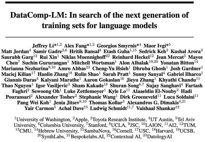基于此,研究团队提出了语言模型数据比较新基准 ——DCLM,这是语言模型训练数据整编(curation)的第一个基准,旨在让 LLM 通过设计高质量数据集来提高模型性能,特别是在多模态领域。