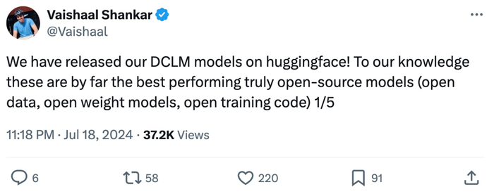 论文作者之一、苹果机器学习团队 Vaishaal Shankar 将 DCLM 模型描述为「真正开源的最佳模型」,因为 DCLM 不仅开源了模型权重,还开源了训练代码和预训练数据集。