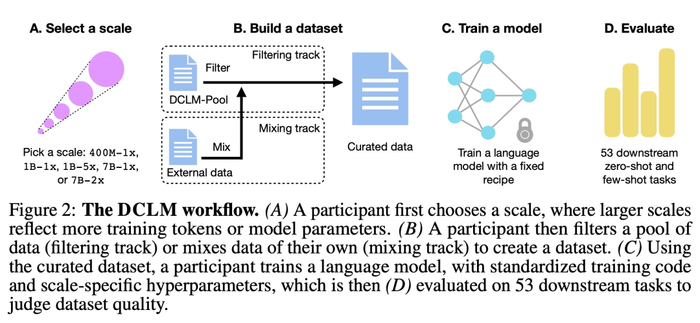 DCLM 整体思路很简单:使用一个标准化的框架来进行实验,包括固定的模型架构、训练代码、超参数和评估,最终找出哪种数据整理策略最适合训练出高性能的模型。