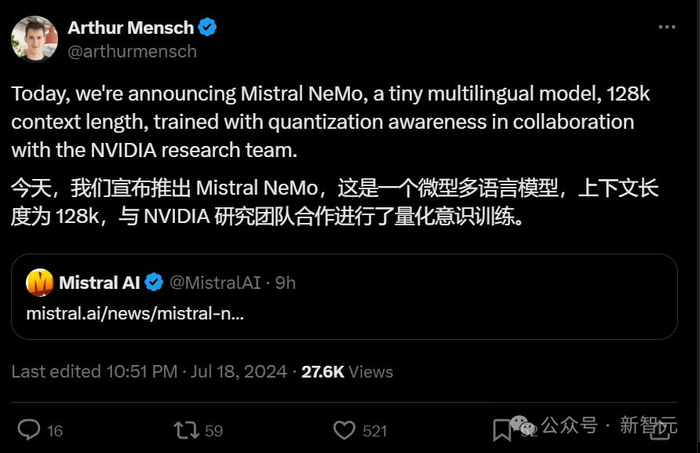 GPT-4o mini发布同天,欧洲最强AI初创公司Mistral立马发布旗下最新最强小模型——Mistral NeMo。