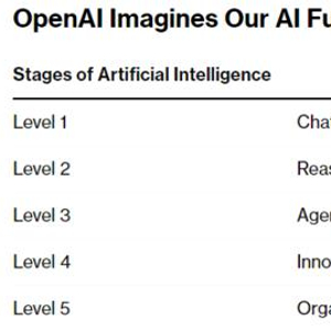 根据彭博社上周报道,OpenAI全新的AGI路线图释出。公司内部将AI能力划分为5个等级,并认为当前AI正处于其中的L1阶段。