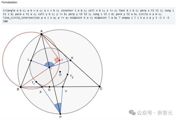 问题4要求证明∠KIL和∠XPY之和等于180°。AlphaGeometry 2建议在BI线上构造一个点E,使得∠AEB=90°。点E有助于确定AB的中点L,形成了许多类似的三角形对,如ABE ~ YBI和ALE ~ IPC,从而证明结论