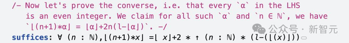 直到代码结束时,AI提出了一个关键等式⌊(n+1)*α⌋ = ⌊α⌋+2n(l-⌊α⌋),使用等式来证明α必须是偶数。